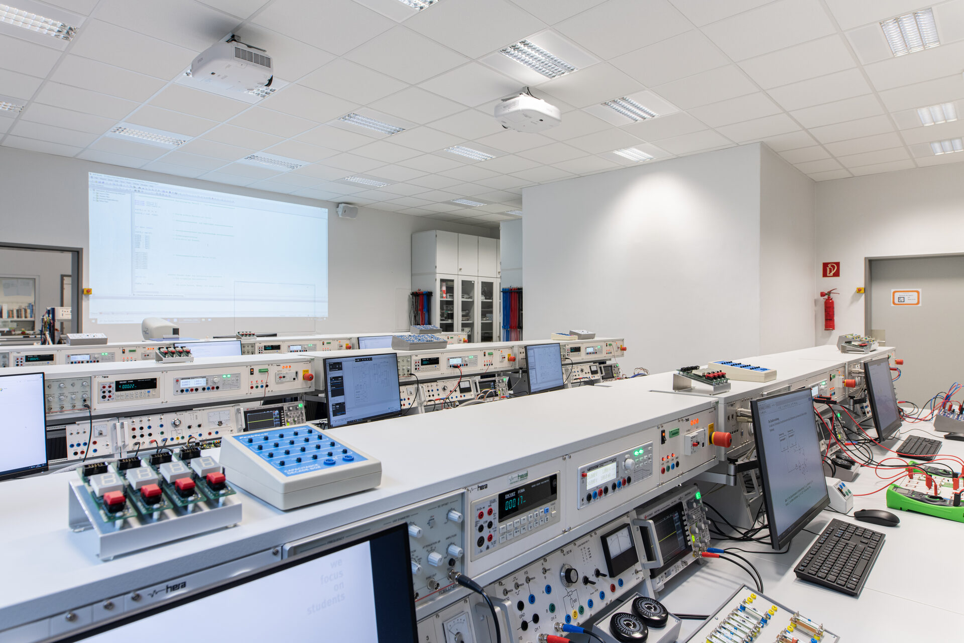 Each laboratory workstation is fully equipped with various laboratory devices such as oscilloscopes, function generators, power supply units and multimeters.