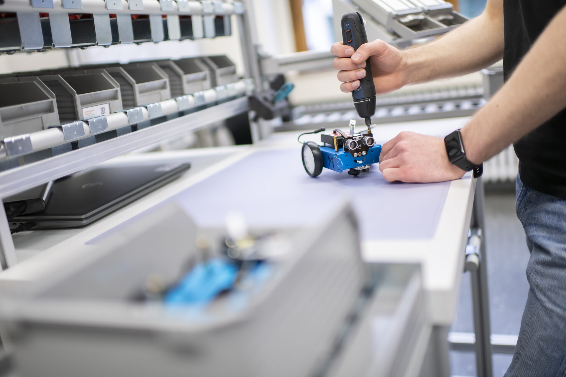 Im Lean Labor werden moderne Montagesysteme und Produktionskonzepte praxisnah erfahrbar gemacht. Anhand der Montage eines kleinvolumigen Produkts zeigen wir, wie sich manuelle Montagesysteme flexibel konfigurieren und materialflusstechnisch verknüpfen lassen. Digitale Assistenz- und Kollaborationssysteme veranschaulichen, wie Technologien der Industrie 4.0 die Handmontage zusätzlich unterstützen und verbessern können. Dabei steht das praktische Erleben im Mittelpunkt: Studierende und Partnerunternehmen können Lean-Methoden und Digitalisierung nicht nur theoretisch kennenlernen, sondern selbst anwenden, bewerten und weiterentwickeln. Ziel ist es, die Prinzipien der Lean Production und der digitalen Fabrik greifbar zu machen und so ein tiefes Verständnis dafür zu schaffen, wie effiziente, zukunftsorientierte Produktionssysteme gestaltet werden.