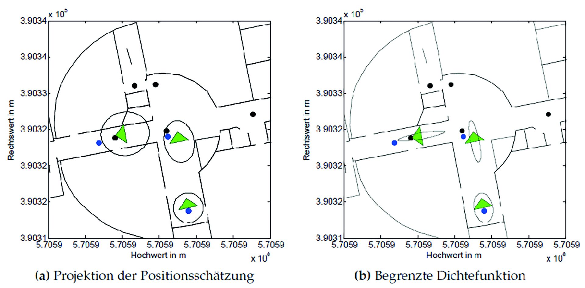 Im Zentrum der Dissertation von Julian Lategahn steht die Lokalisierung von Personen in Gebäuden. Er untersucht dabei Algorithmen zur Integration von Karteninformationen in die Positionsbestimmung, um deren Genauigkeit zu verbessern. Zum Hintergrund: Innerhalb von Gebäuden können die sonst üblicherweise verwendeten Satellitennavigationssysteme aufgrund von Signalabschwächungen nicht eingesetzt werden. Es werden daher häufig andere Funktechniken zur Lokalisierung verwendet. Die Informationen, die von diesen Technologien geliefert werden, sind in der Regel mit stochastischen Messfehlern behaftet und werden üblicherweise in bayesschen Zustandsschätzern mit Informationen anderer, häufig komplementärer, Sensoren fusioniert. Zu nennen sind insbesondere Inertialsensoren, die relative Informationen zur Bewegung eines Objektes oder einer Person liefern. Die Integration von Karteninformationen in Zustandsschätzer zur Verbesserung der Positionsbestimmung wurde bisher wenig untersucht.