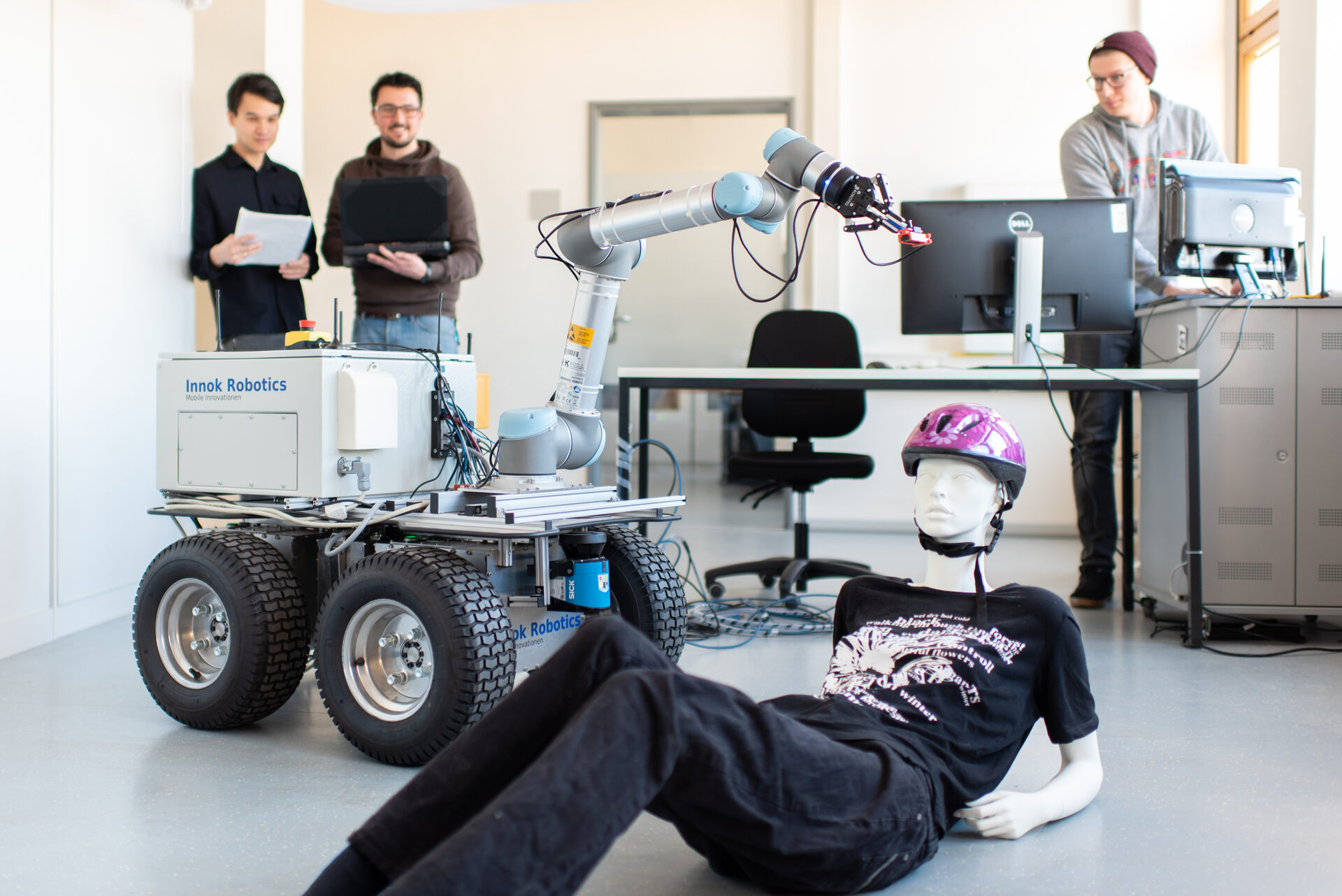 Since 2019, the robotics group has been developing a joint teaching program. For example, the group has been carrying out a joint block week project as part of the Ruhr Master's School since November 2019: "Search and Rescue" - Autonomous robots navigate and map(Prof. Becker, Prof. Röhrig ) in unknown terrain, recognize and classify objects using a camera(Prof. Thiem ) and collect objects to be rescued using a gripper arm(Prof. Liu , Prof. Straßmann ).
