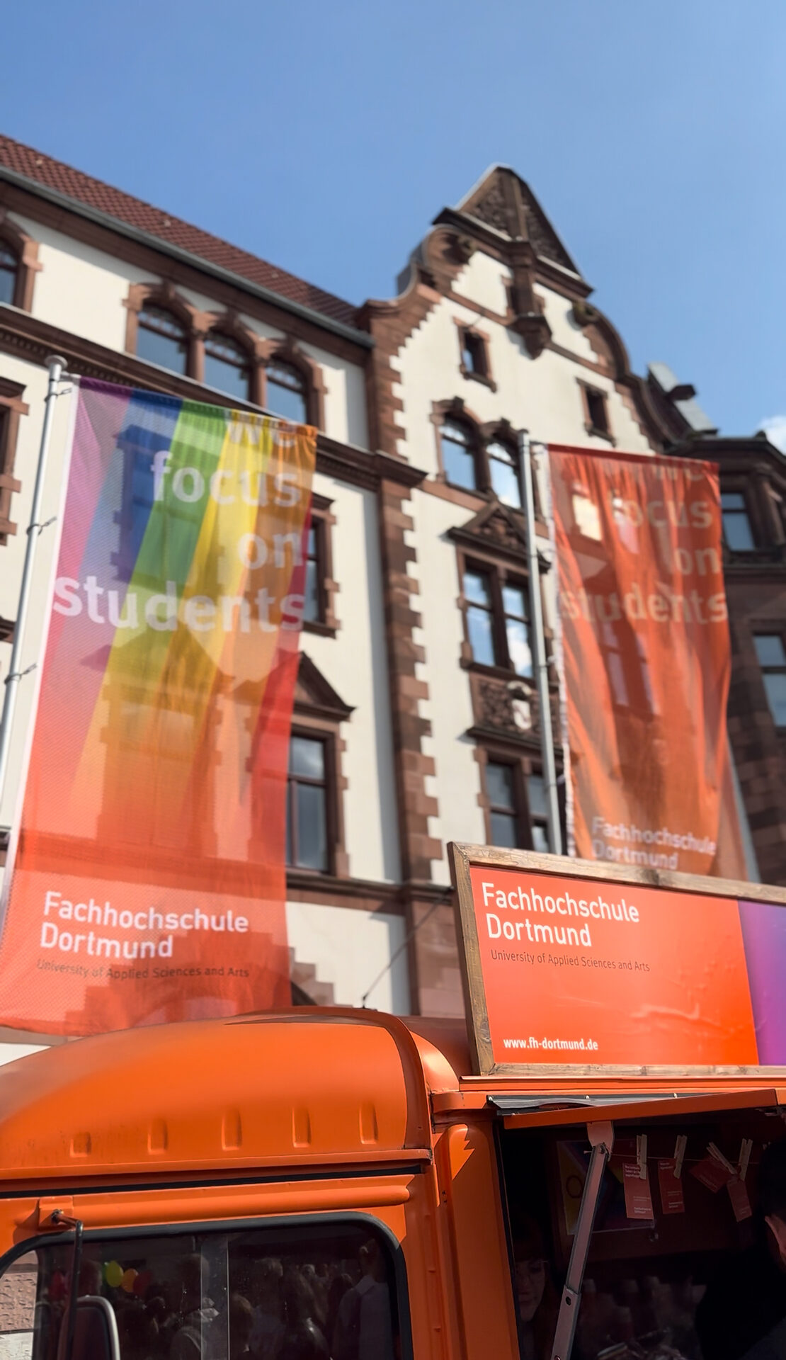 Beim Straßenfest am 16. August 2025 wird die FH Dortmund mit dem orangefarbenen Kultfahrzeug – dem Citroen HY – auf dem Dortmunder Friedensplatz präsent sein. Der Allgemeinen Studierendenausschuss (AStA) ist mit vor Ort. An den Campus-Standorten der FH Dortmund wehen zudem die Regenbogenflaggen.