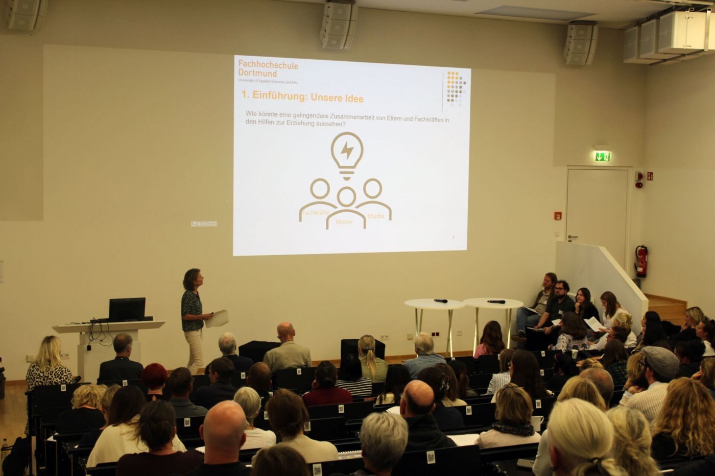 An der Vorbereitung des Fachtags waren Studierende der FH Münster (begleitet durch Prof. Remi Stork und Michaela Berghaus) und der FH Dortmund (begleitet von Prof. Dr. Nicole Knuth) maßgeblich beteiligt: In zwei Seminaren führten sie Interviews mit Eltern über das Erleben der Zusammenarbeit mit der Jugendhilfe durch und erarbeiteten mit ihnen unter anderem Filme, einen Comic und eine Fotodokumentation. Außerdem wurden in Form von Rollenspielen Forderung zu neuen Formen der Zusammenarbeit von Eltern und Fachkräften präsentiert. Diese wurden auf der großen Bühne des Hörsaals präsentiert und stießen auf viel Resonanz. „Die Neugier der Fachkräfte auf die Erfahrungen der Studierenden war beeindruckend und die Studierenden wiederum waren ganz begeistert über das große Interesse an ihren Ergebnissen“, sagte Mitorganisator Prof. Dr. Remi Stork.