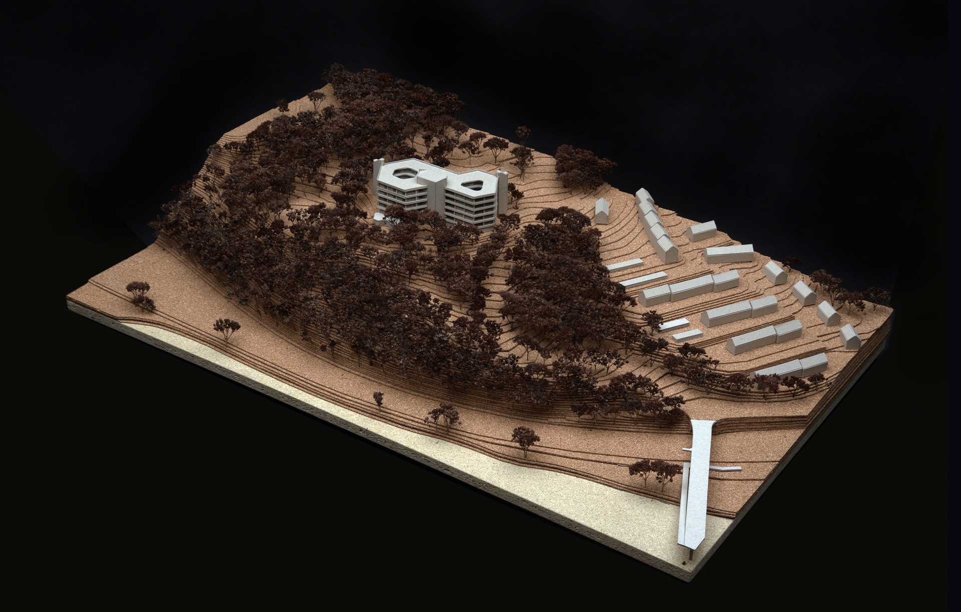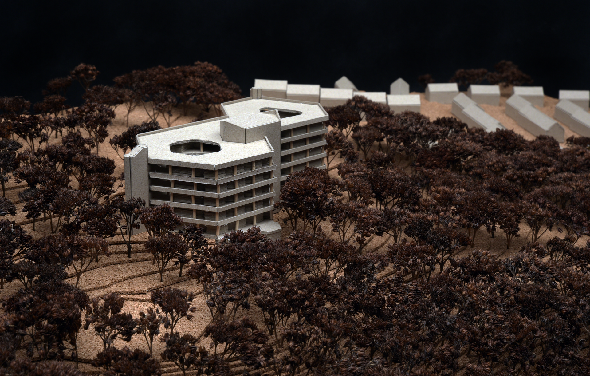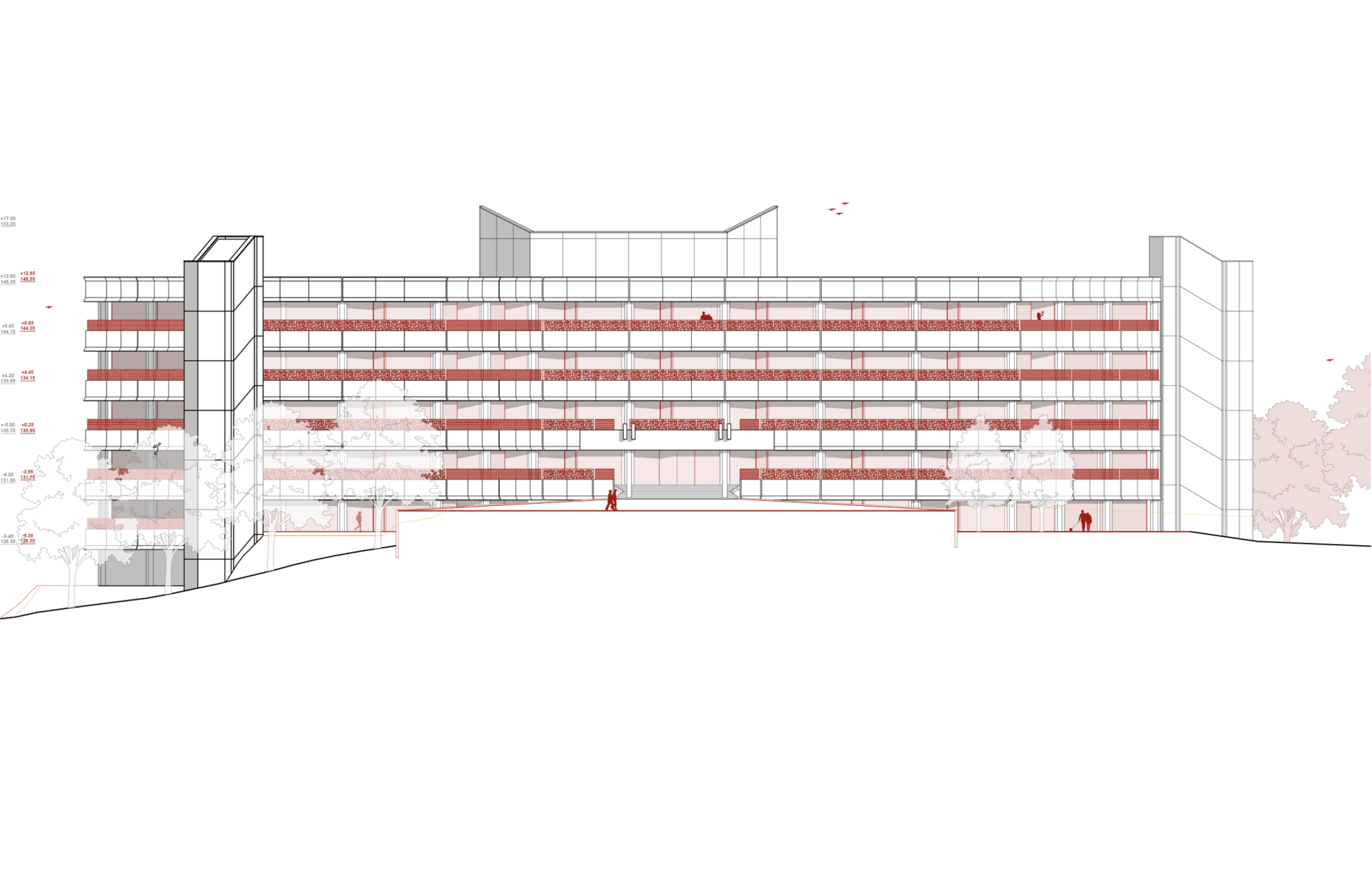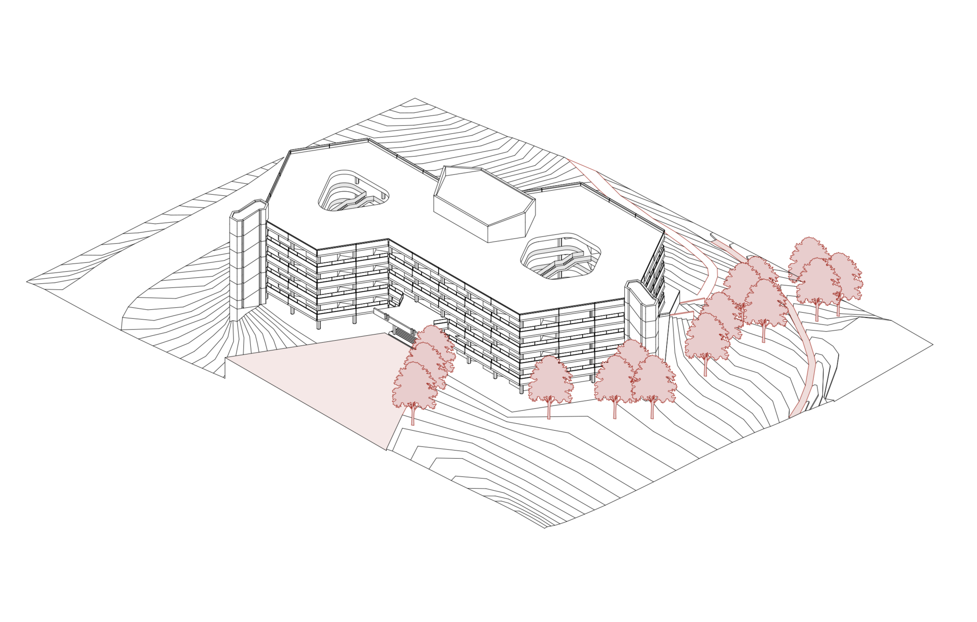 In seiner Bachelorarbeit entwickelt Lennart Girkes einen wegweisenden Transformationsansatz für ein Verwaltungsgebäude der 1975er Jahre. Statt des geplanten Abrisses schlägt er eine Umnutzung zu einem vielfältigen Wohn- und Arbeitsort vor, ergänzt durch Sport- und Erholungsangebote. Zugleich plädiert er für den Verzicht auf die geplante Neubausiedlung und setzt stattdessen auf Aufforstung. Damit leistet die Arbeit einen starken Beitrag zur Bauwende und zum Erhalt bestehender Strukturen.