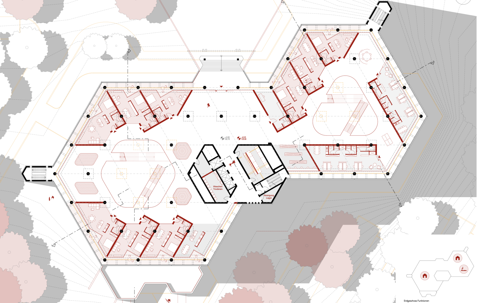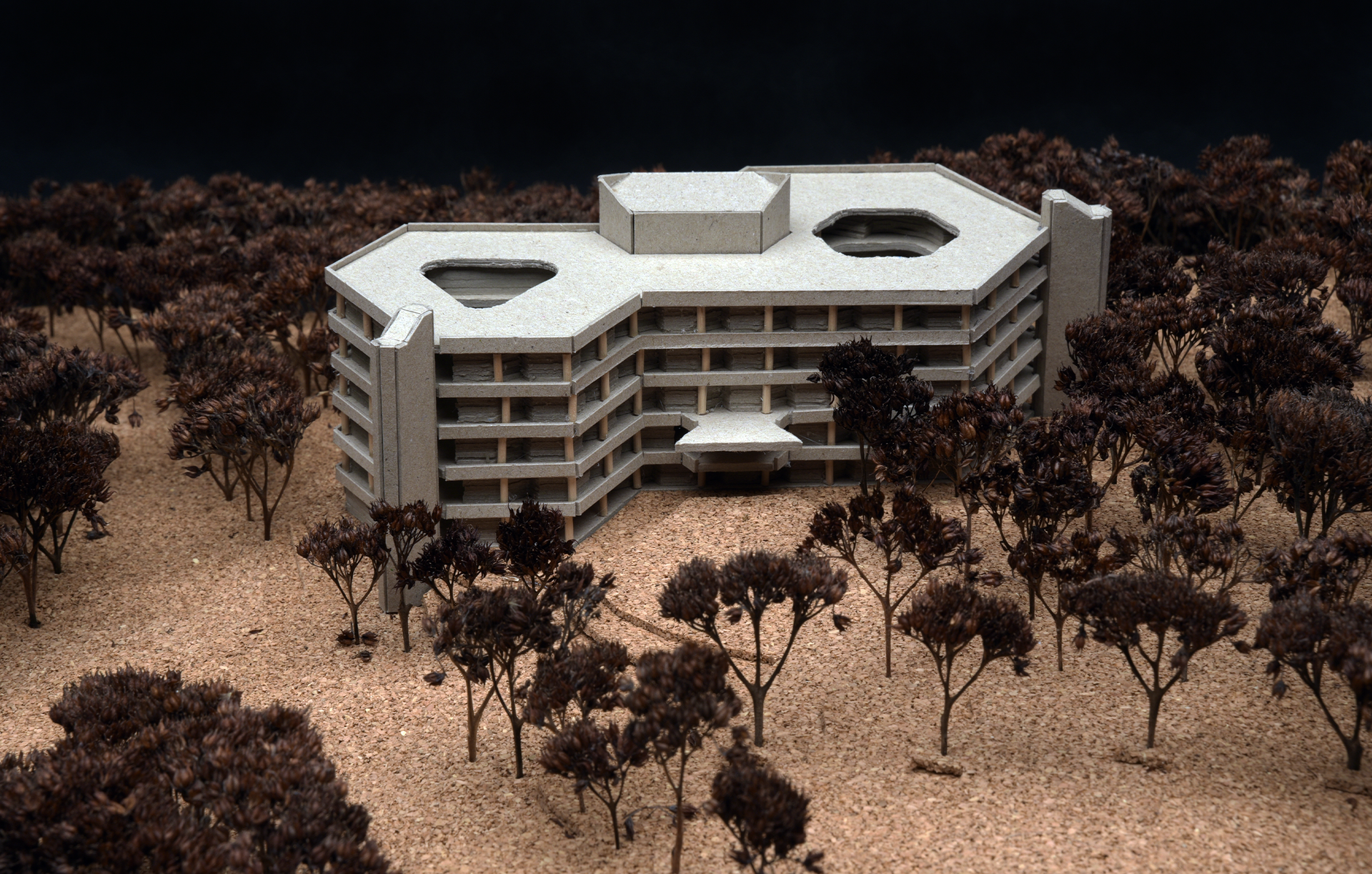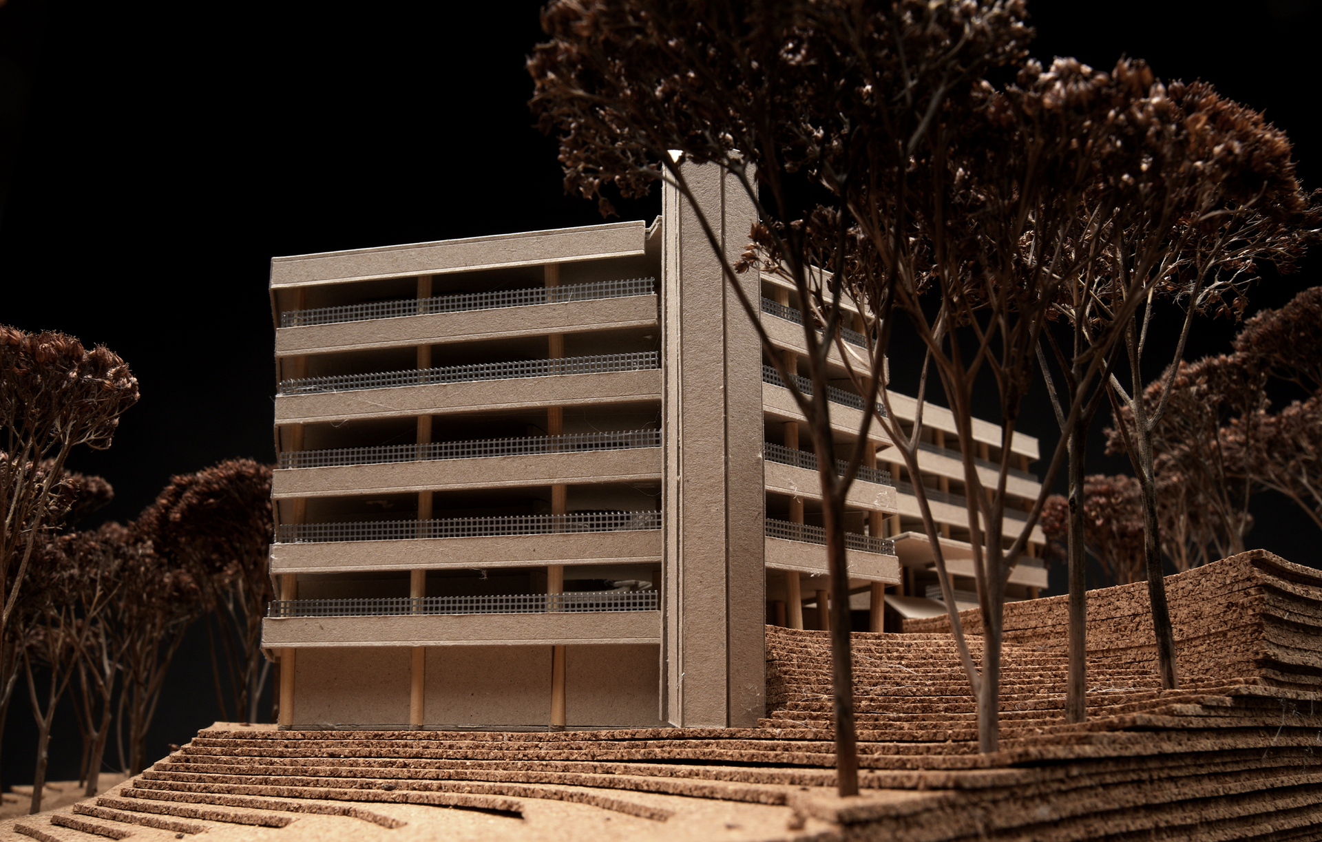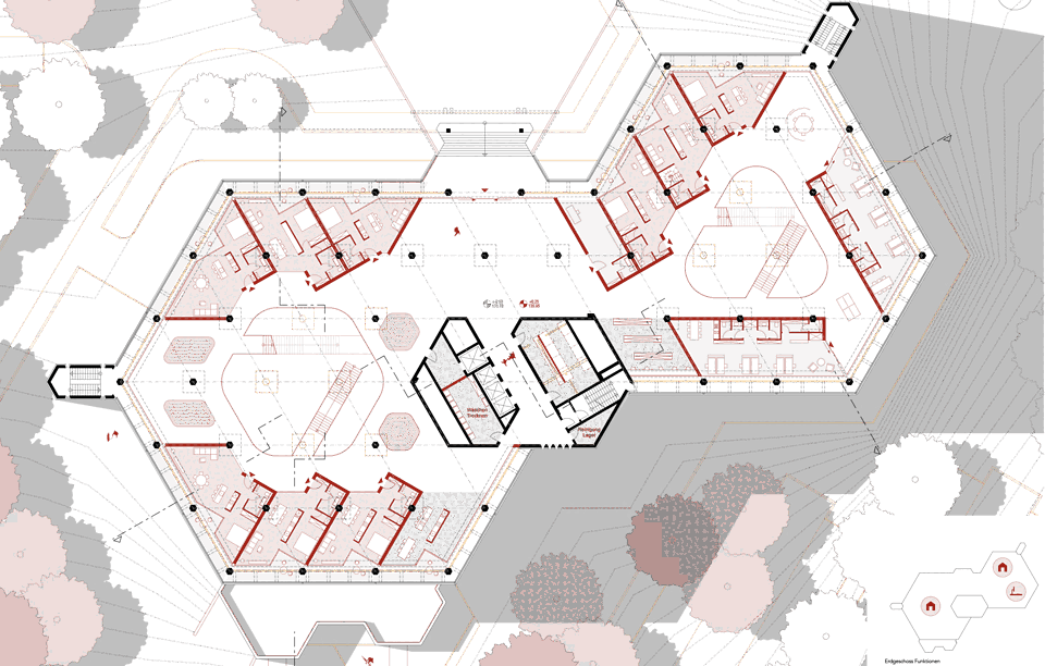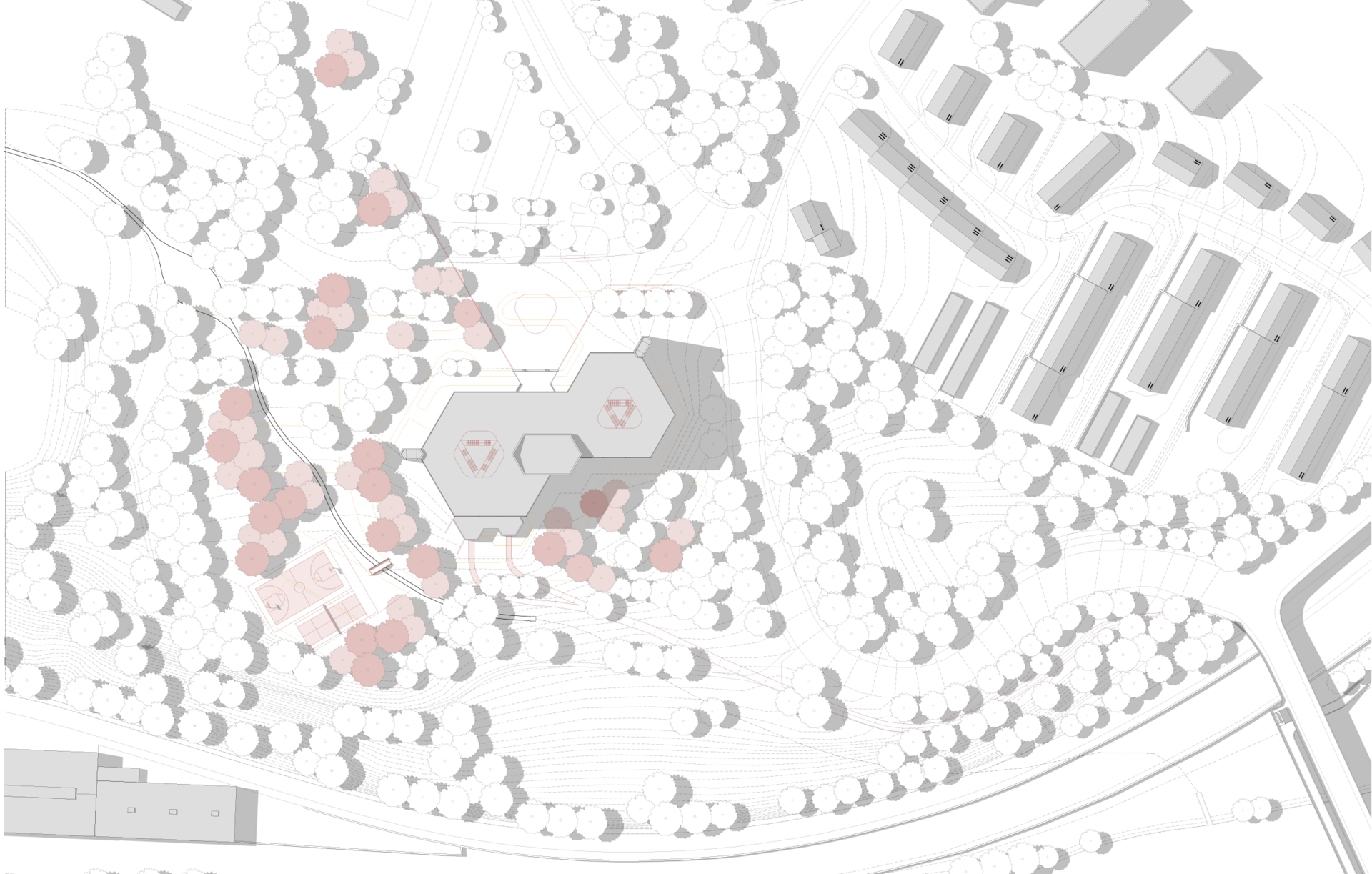 In seiner Bachelorarbeit entwickelt Lennart Girkes einen wegweisenden Transformationsansatz für ein Verwaltungsgebäude der 1975er Jahre. Statt des geplanten Abrisses schlägt er eine Umnutzung zu einem vielfältigen Wohn- und Arbeitsort vor, ergänzt durch Sport- und Erholungsangebote. Zugleich plädiert er für den Verzicht auf die geplante Neubausiedlung und setzt stattdessen auf Aufforstung. Damit leistet die Arbeit einen starken Beitrag zur Bauwende und zum Erhalt bestehender Strukturen.