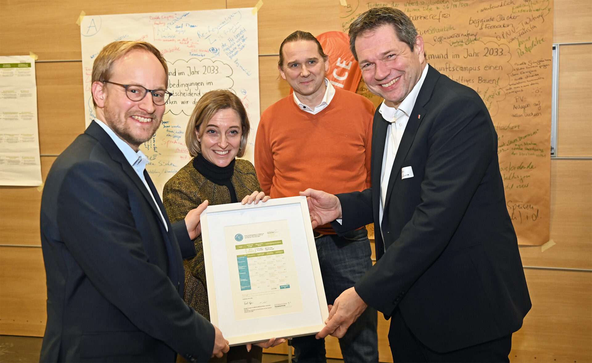 Prof. Dr. Franz Vogler (links), Prorektor für Nachhaltigkeit und Digitalisierung, und Thomas Kendziorra (rechts), Vertreter der FH-Kanzlerin, nahmen das Gemeinwohl-Testat von Heike Marzen, Geschäftsführerin der Dortmunder Wirtschaftsförderung, und Dr. Frank Ragutt, Regionalgruppe Dortmund des Gemeinwohl-Ökonomie Deutschland e.V., entgegen.