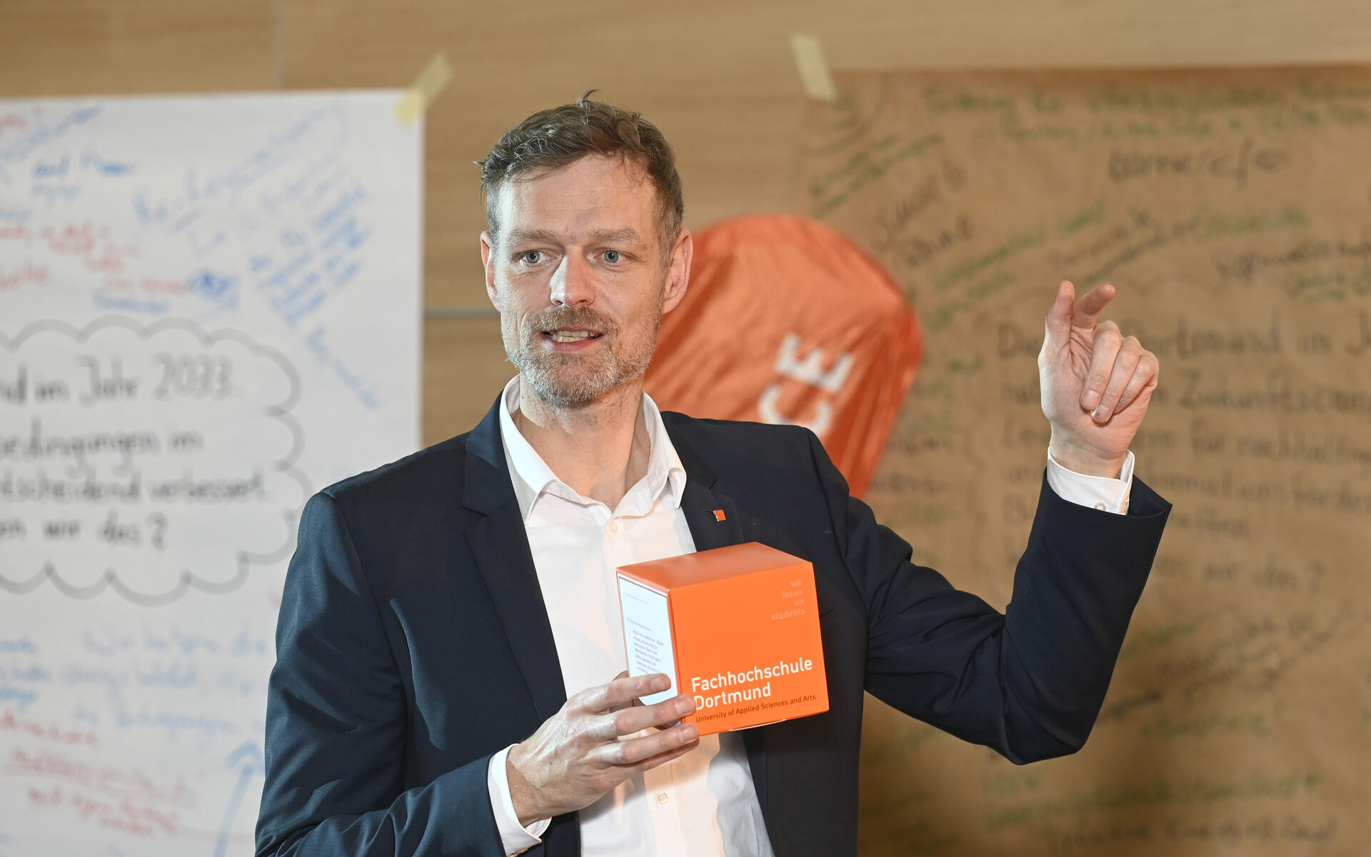 Prof. Dr. Franz Vogler, Prorektor für Nachhaltigkeit und Digitalisierung der FH Dortmund, würdigte bei der Testat-Verleihung das Engagement der Beschäftigten, Lehrenden und Studierenden der Fachhochschule bei der Erstellung der Gemeinwohlbilanz.