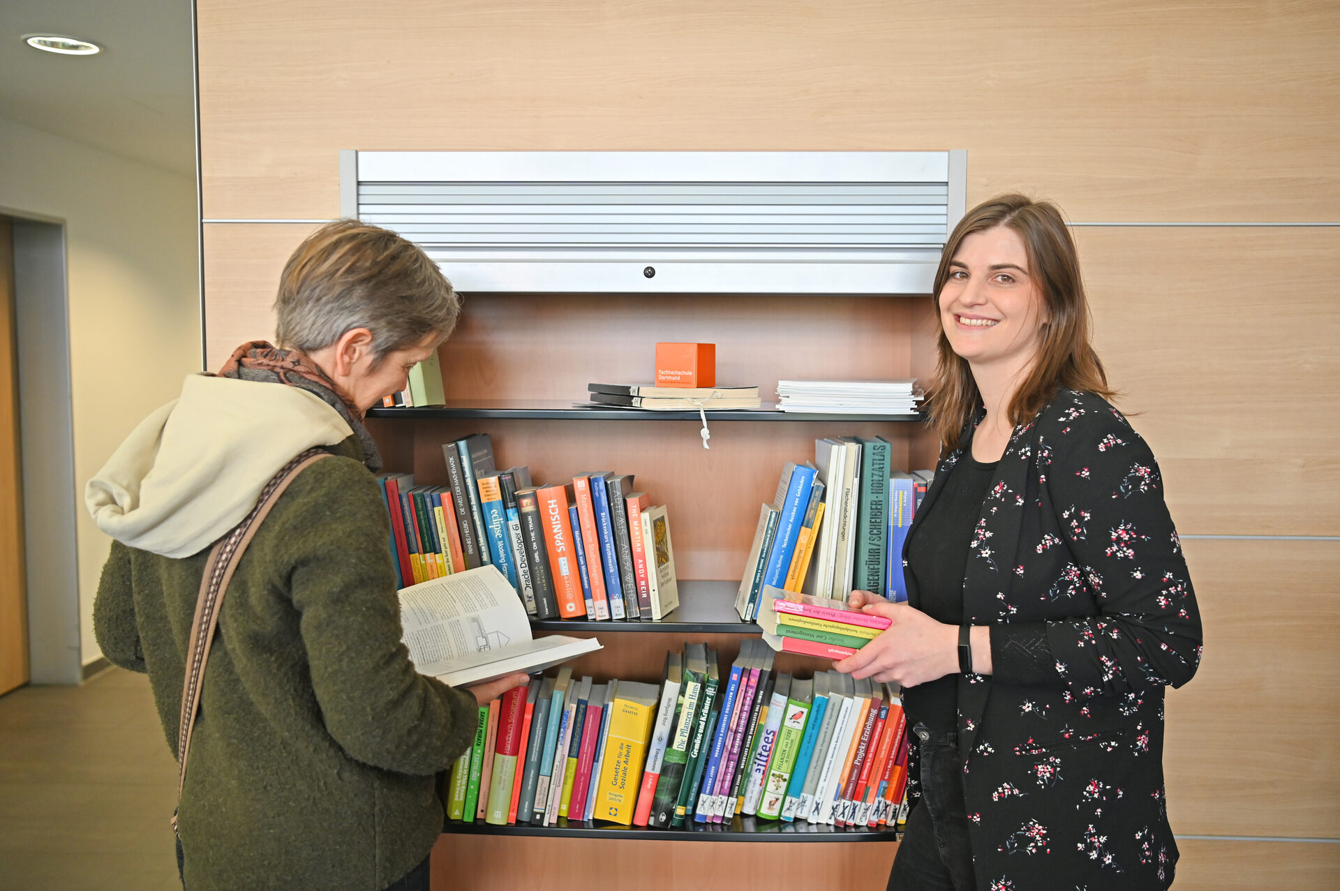 Die Regale im linken Eingangsbereich und neben den Automaten kommen aus dem Gebrauchtmöbellager der Fachhochschule. Ganz im Sinne der Nachhaltigkeit erhalten sie nun eine neue Aufgabe, erklärt Eva Schameitat, FH-Bibliothekarin und Mitglied des Arbeitskreises: „Zum einen stellen wir hier Literatur zur Verfügung, die wir aus dem Bestand der Bibliothek ausgesondert haben. Zum anderen sind alle Interessierten eingeladen, eigene gebrauchte Exemplare einzustellen - und natürlich die Bücher kostenlos mitzunehmen, die sie gerne lesen möchten.“ Schon seit vielen Jahren verschenkt die Bibliothek (an allen drei Standorten) nicht mehr benötigte Medien an ihre Nutzer*innen. Die offenen Regale an einem so zentralen Standort machen dieses Angebot nun auch außerhalb der Bibliothek sichtbar und laden zu eigener Beteiligung ein.