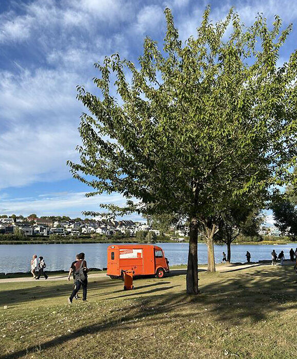 Zwischen den Rennen bot das orange oszillierende Lager des FH-Teams den Paddler*innen Erholung und den Besuchenden die bewährte FH-Ganzkörperbehandlung: Wassereis für den Gaumen, Sonnenbrille für die Nase, Liegestuhl fürs Gesäß und ein herzliches „Hi!“ fürs Herz.