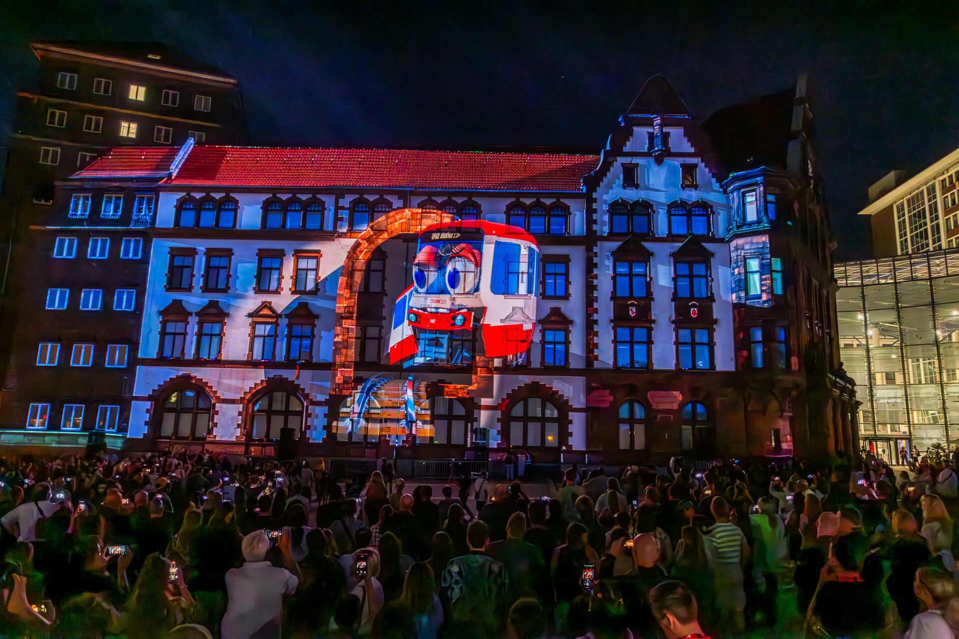 Bereits bei der Auftakt-Party von DORTBUNT am Freitagabend hatte die Fachhochschule ihre Finger im Spiel. Oder besser gesagt ihre Hochleistungsbeamer: Das storyLab kiU (Öffnet in einem neuen Tab) um den künstlerischen Leiter Harald Opel (Öffnet in einem neuen Tab) zauberte mit acht Projektoren eine mitreißende Achterbahnfahrt an die Fassade des alten Stadthauses. Auf dem Friedensplatz verfolgten – kurz vor dem Konzert von Top-Act Max Giesinger – rund 8.000 Besuchende das 3D-Mapping-Spektakel. Das Gebäude wurde dabei scheinbar lebendig und nahm in einer virtuellen Straßenbahn die Umherstehenden mit auf eine rasante Reise in die Vergangenheit, Gegenwart und Zukunft der Stadt.