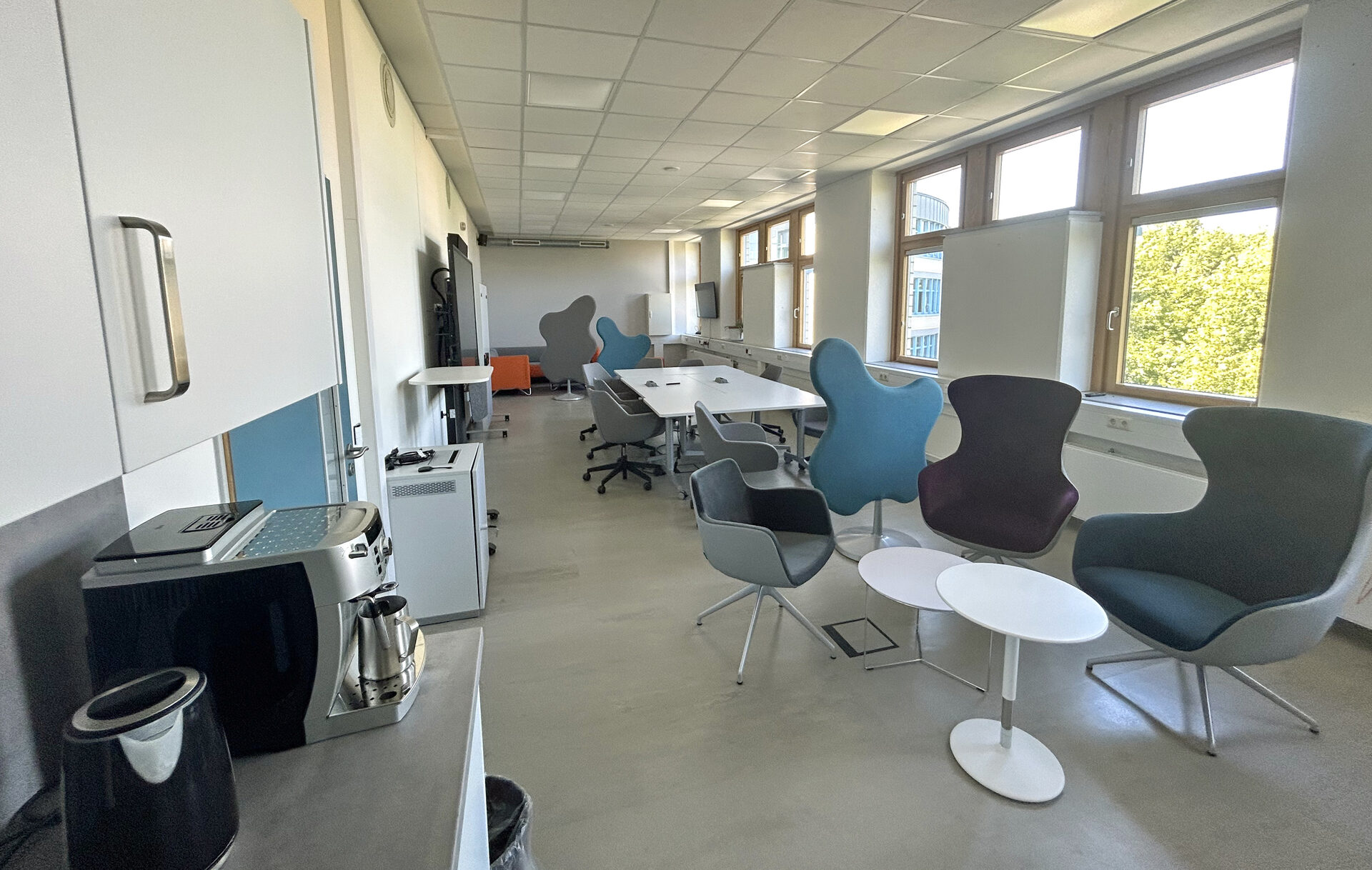 Der erste Blick fällt sofort auf die kleine Sofa-Ecke mit den Oktopus-Plüschtüren. Ein bisschen Teppich, ein schöner Tisch. Der TeamSpace fühlt sich anders an. Anders als Büro. Anders – aber richtig gut. Der neue Fußboden in Beton-Optik hat Stil und bietet versteckte Stromtankstellen. Der Konferenztisch ist modular und flexibel. Smartboard, Kameras- und Mikrofonsystem sind am Fachbereich Standard und auch hier zu finden. Der TeamSpace ist vielfältig nutzbar. Allein und im Team, zum kreativen Brainstormen, konzentrierten Arbeiten, für Sport beim Pausenexpress oder auch mal zum Chillen.