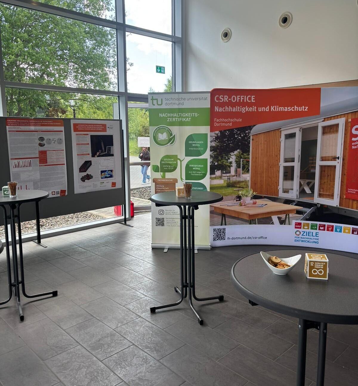In the week from 19 to 22 May 2025, the Sustainability Week took place, organized by the Sustainability Offices and the General Student Committees (AStA) of the Fachhochschule Dortmund and the Technical University of Dortmund as well as the Studierendenwerk Dortmund and the university group CampusForFuture. The week offered a mixture of workshops, lectures and action and information stands. At the Market of Opportunities on the first day, we provided information at our stand about the possibility of a doctorate at Fachhochschule Dortmund and about sustainable options. On the last day, some of our doctoral students presented their sustainable doctoral projects as part of a poster exhibition at the Impact Cup awards ceremony in the kostbar.